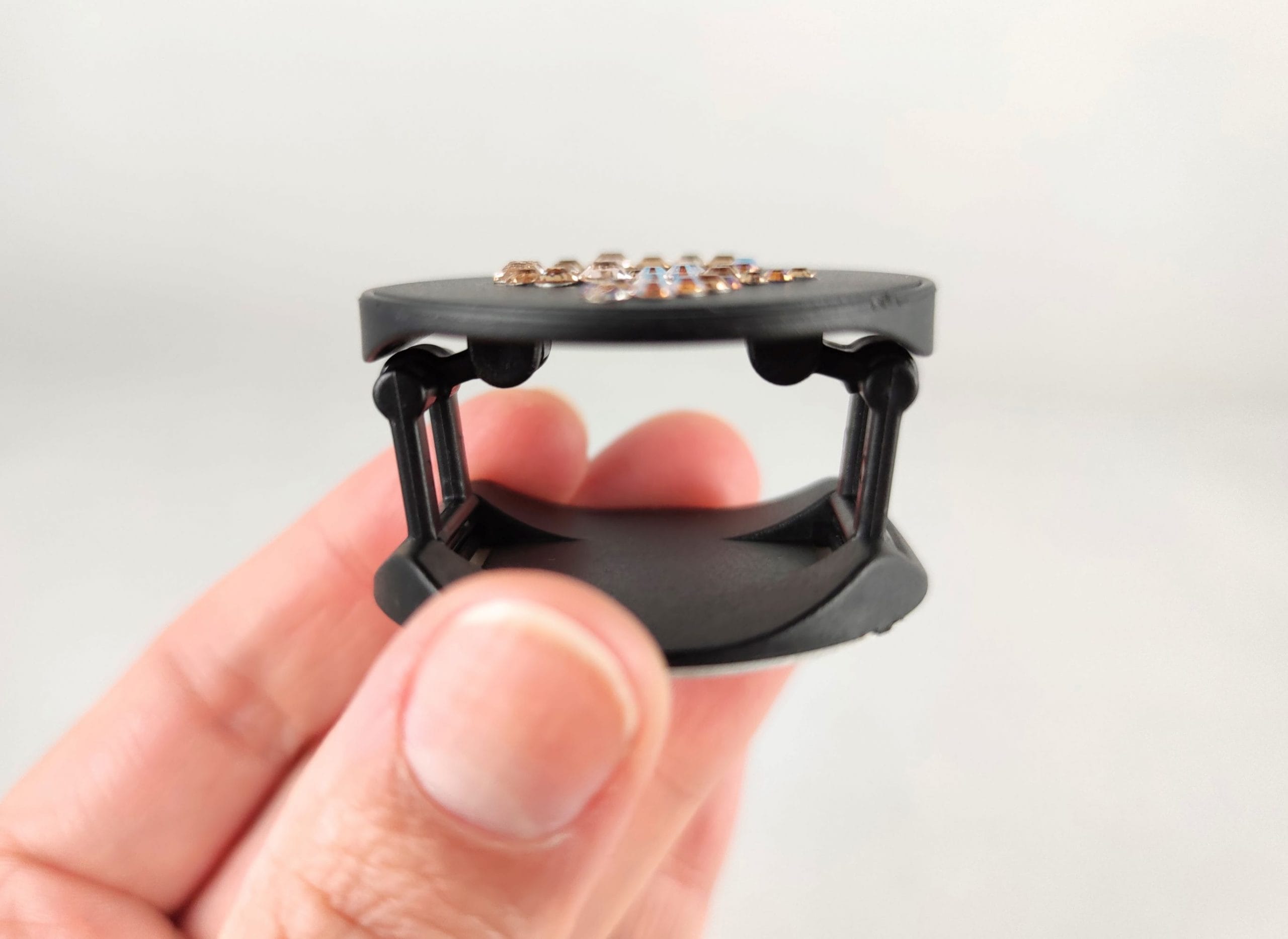 The grip folds out to make it easier to hold your phone when taking pictures or scrolling, and it also doubles as a stand so you can sit back and watch your favourite films. It has a self-adhesive sticker underneath, to stick directly onto your phone, or a phone case.
