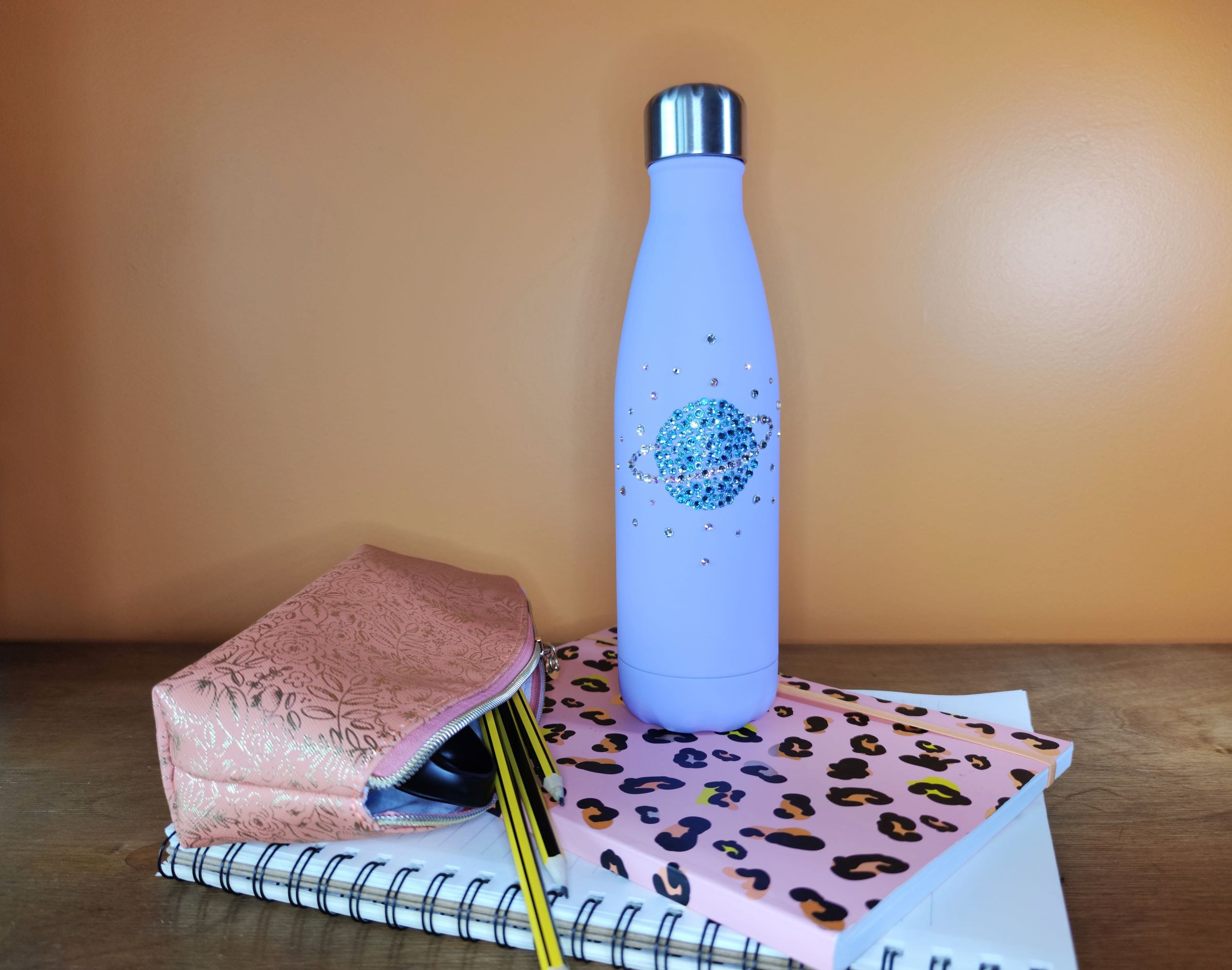 This dazzling bottle is simply out of this world!! This little planet is straight from the Rhinestone Cowboy Galaxy and shines as bright as any star in the night sky. Bottle and the main body of the planet are available in a range of colours, if you would like the ring and stars in a different colour just drop us a note in the Order Notes section at checkout. 500ml, insulated, keeps drinks hot for 12 hours or cold for 24 hours.